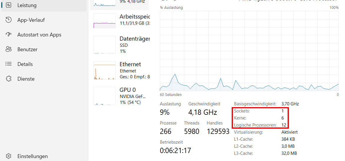 - Dort siehst du die Details zu Kernen, logischen Prozessoren (Threads) und Sockets (physischen CPUs).