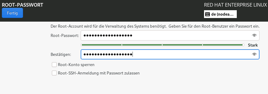 - Besonders wichtig: Unter „Benutzereinstellungen“ findest du das „Root-Passwort“. Lege hier ein sicheres Administrator-Passwort fest (mindestens 6 Zeichen, Mix aus Groß- und Kleinschreibung sowie Ziffern). Sonderzeichen sorgen für zusätzliche Sicherheit. Gib das Passwort doppelt ein und klicke auf „Fertig“.