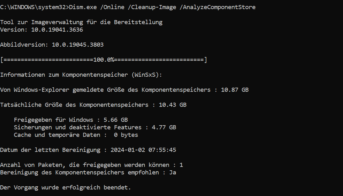 Die Dauer des Scans und der Bereinigung richtet sich nach der aktuellen Datenmenge im WinSxS-Ordner.
