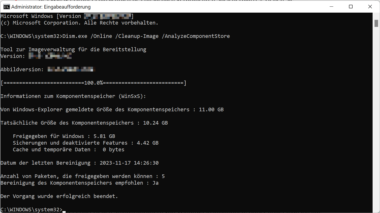 Mit dem Befehl Dism.exe /Online /Cleanup-Image /AnalyzeComponentStore analysierst du den tatsächlichen Speicherverbrauch des WinSxS-Ordners. Nutze danach den Befehl Dism.exe /Online /Cleanup-Image /spsuperseded, um den Bereinigungsvorgang zu starten.