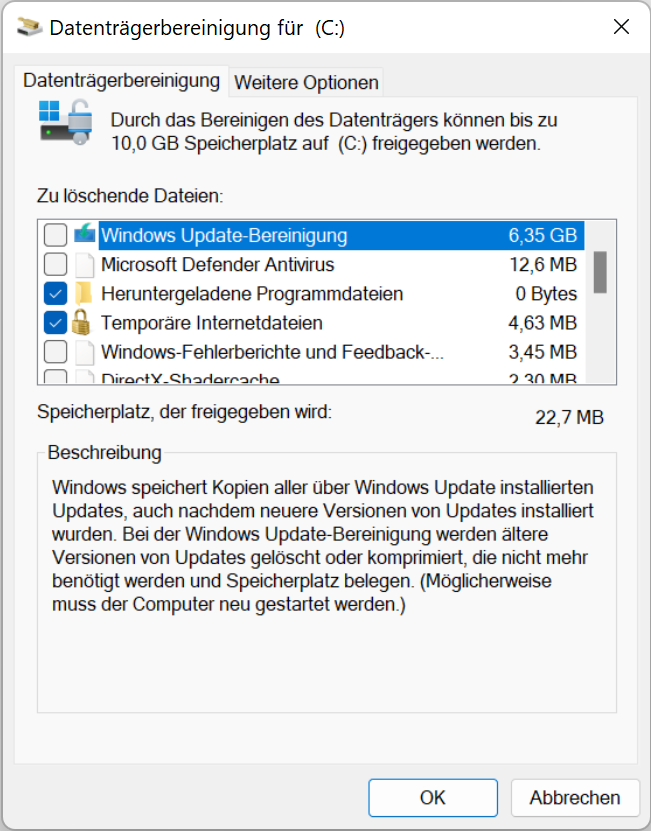 Falls du keine tiefe Bereinigung wünscht, kannst du den Ordner über die klassische Datenträgerbereinigung verkleinern. Nutze dazu das Werkzeug cleanmgr.