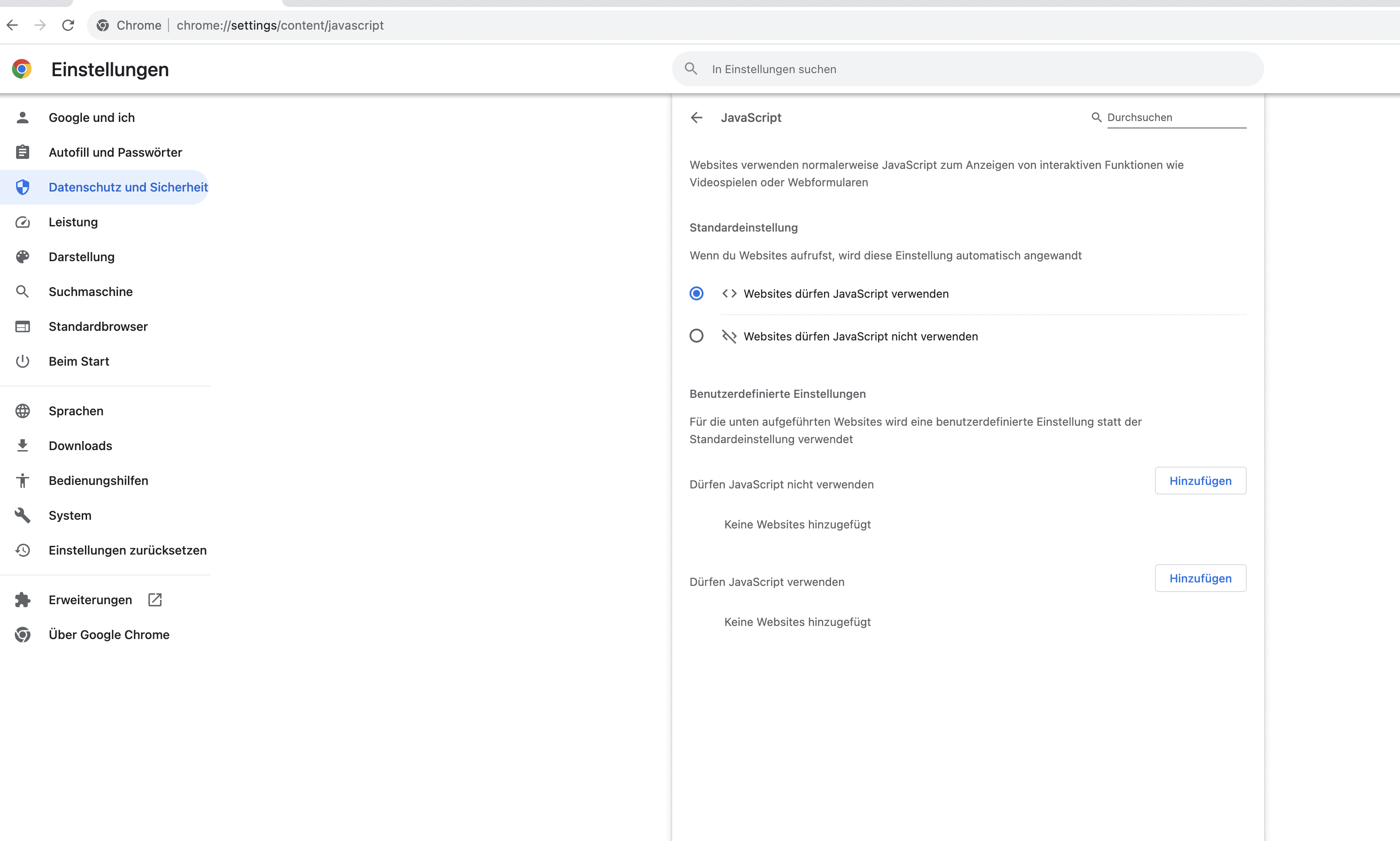 - Hier siehst du die Option „Websites dürfen JavaScript verwenden“. Aktiviere den Punkt daneben, um JavaScript zu erlauben. Möchtest du es abschalten, wähle die gegenteilige Option.