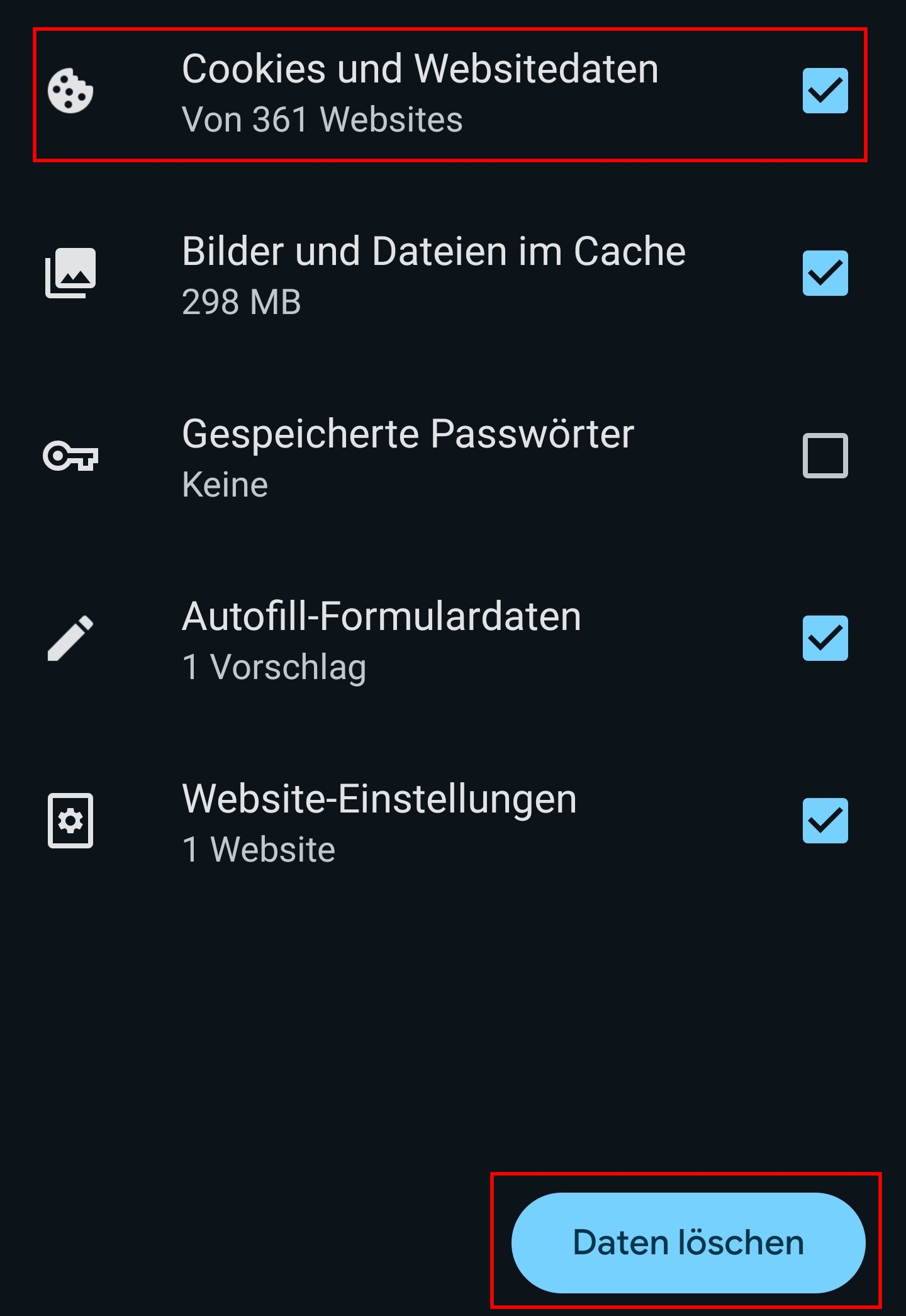 - Setze ein Häkchen bei „Cookies und andere Websitedaten“.