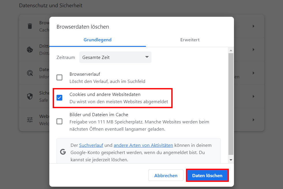 - Bestätige die Auswahl mit „Daten löschen“, um alle aktuellen Cookies in Chrome zu entfernen. Achte darauf, dass beim „Zeitraum“ die Option „Gesamte Zeit“ aktiv ist – sonst löschst du nur die Daten der letzten Stunden oder Tage.