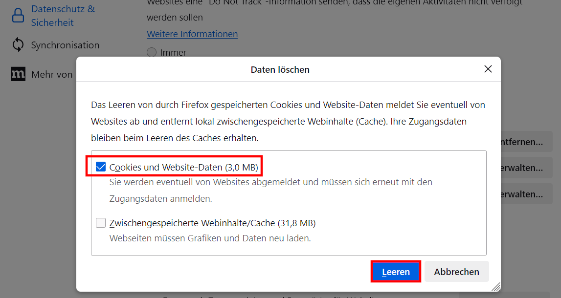 - Markiere „Cookies und Website-Daten“. Bestätige das Löschen der Firefox-Cookies mit einem Klick auf „Leeren“.